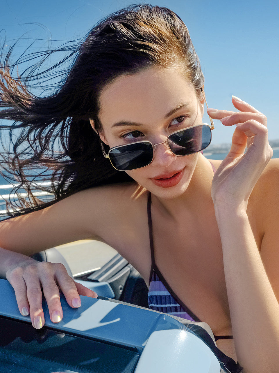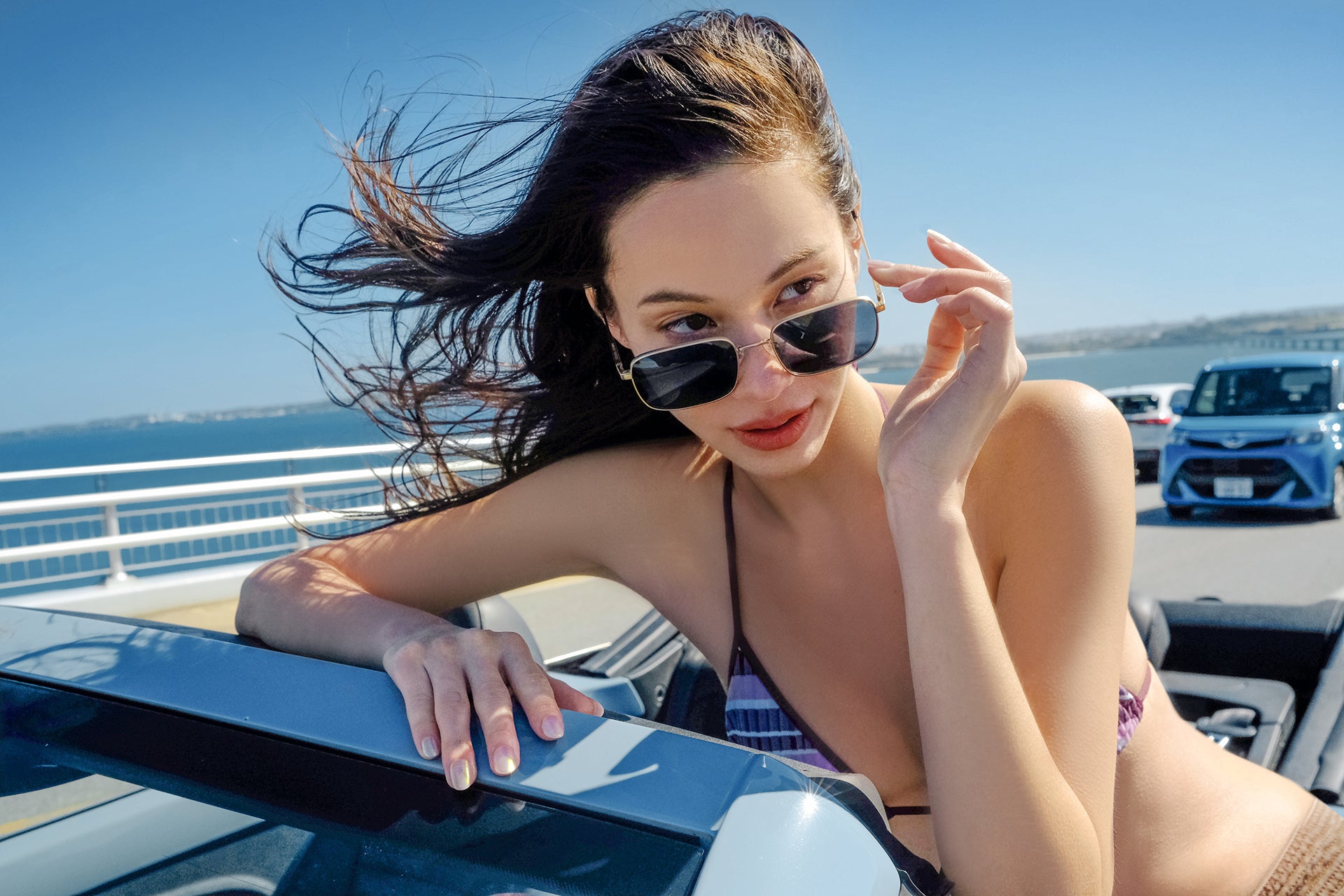It’s no surprise she frequently visits the Okinawa Prefecture known for its diverse coral reefs. Among its islands is our chosen location. Although going to Miyako is considered work, our campaign takes after Kiko’s idea of a vacation. In mere days, she introduces us to the local cuisine, whisks us to a catamaran ride overlooking the panoramic Irabu Bridge, and takes us to hidden beaches all while driving a blue convertible Volkswagen Beetle Cabriolet.