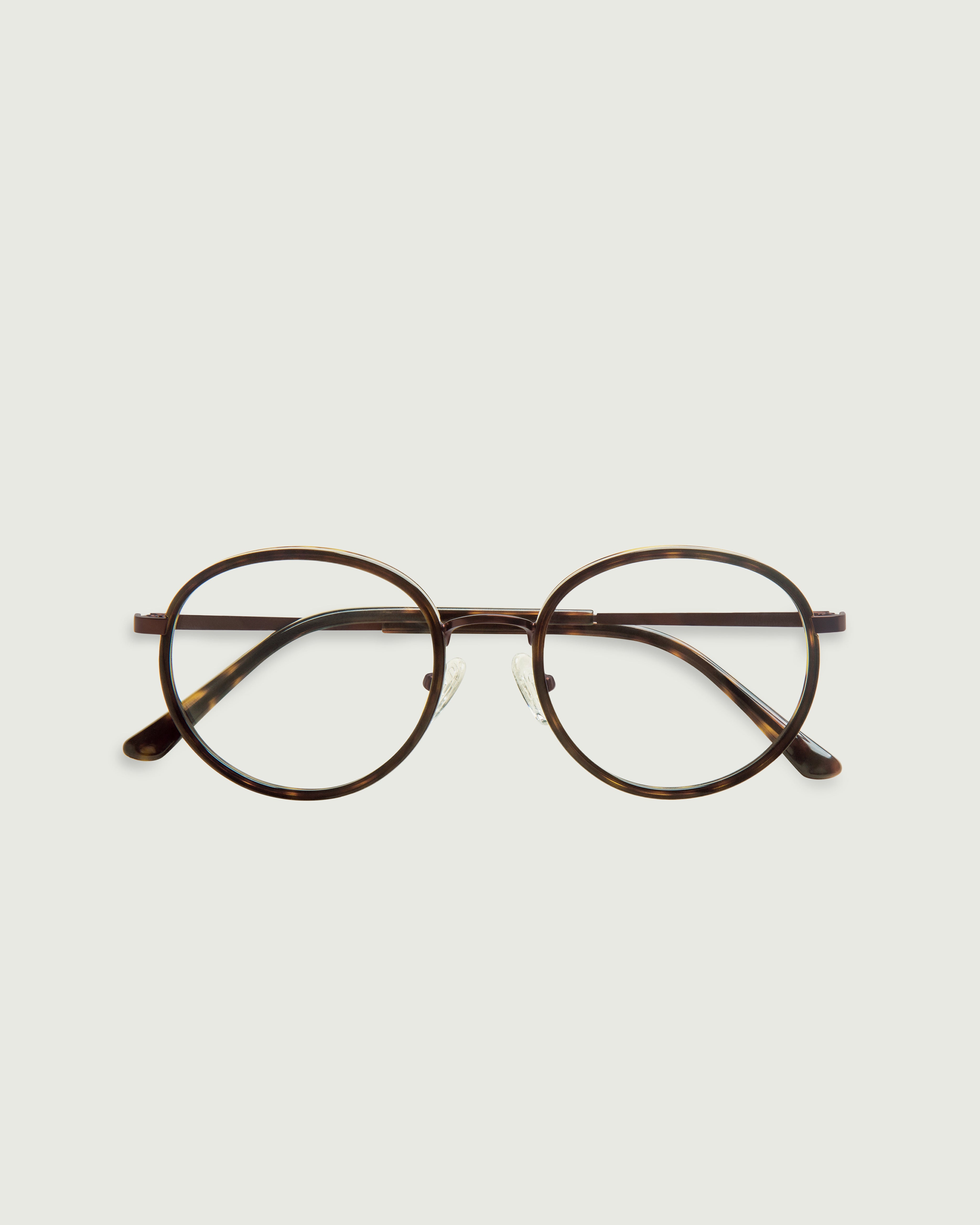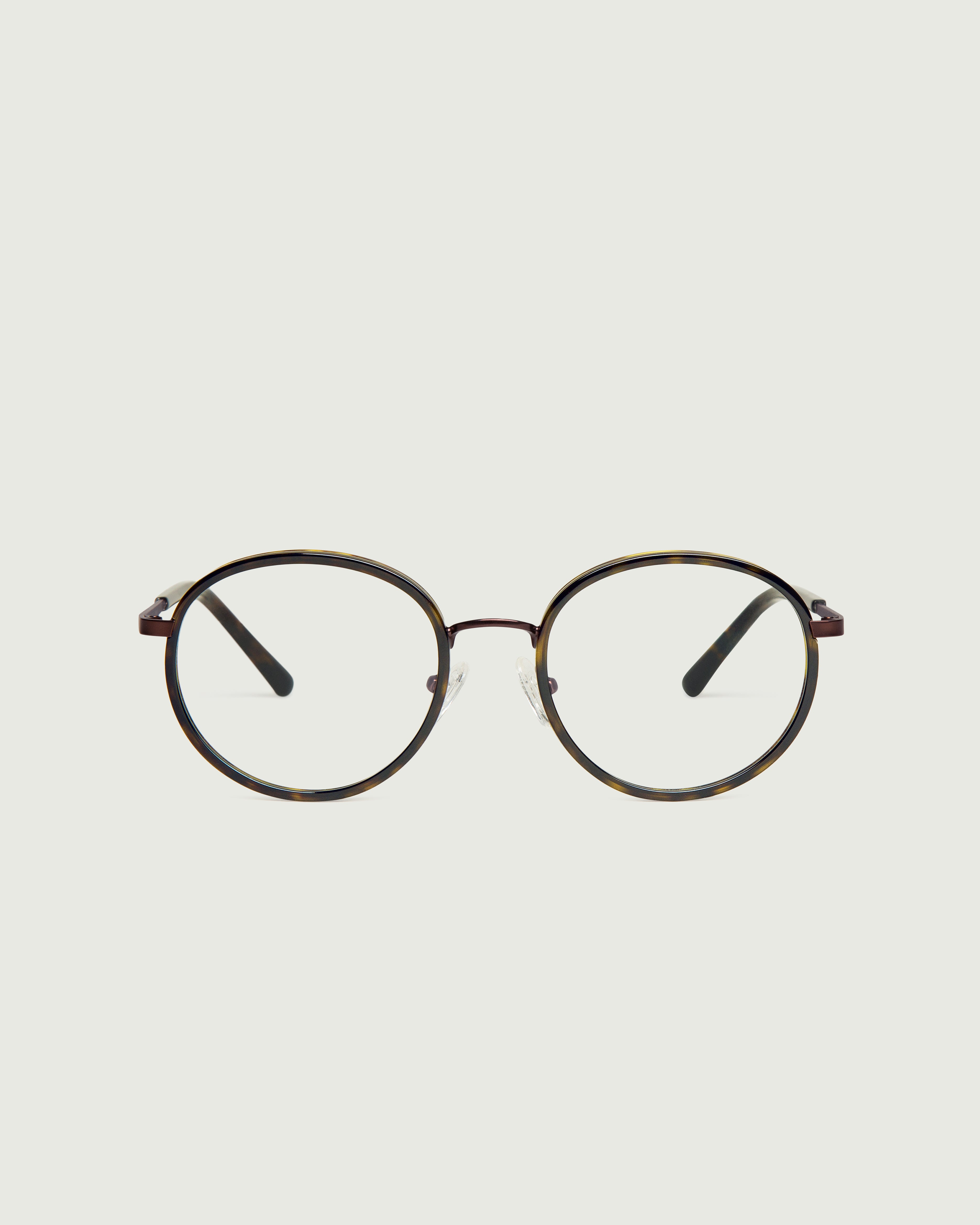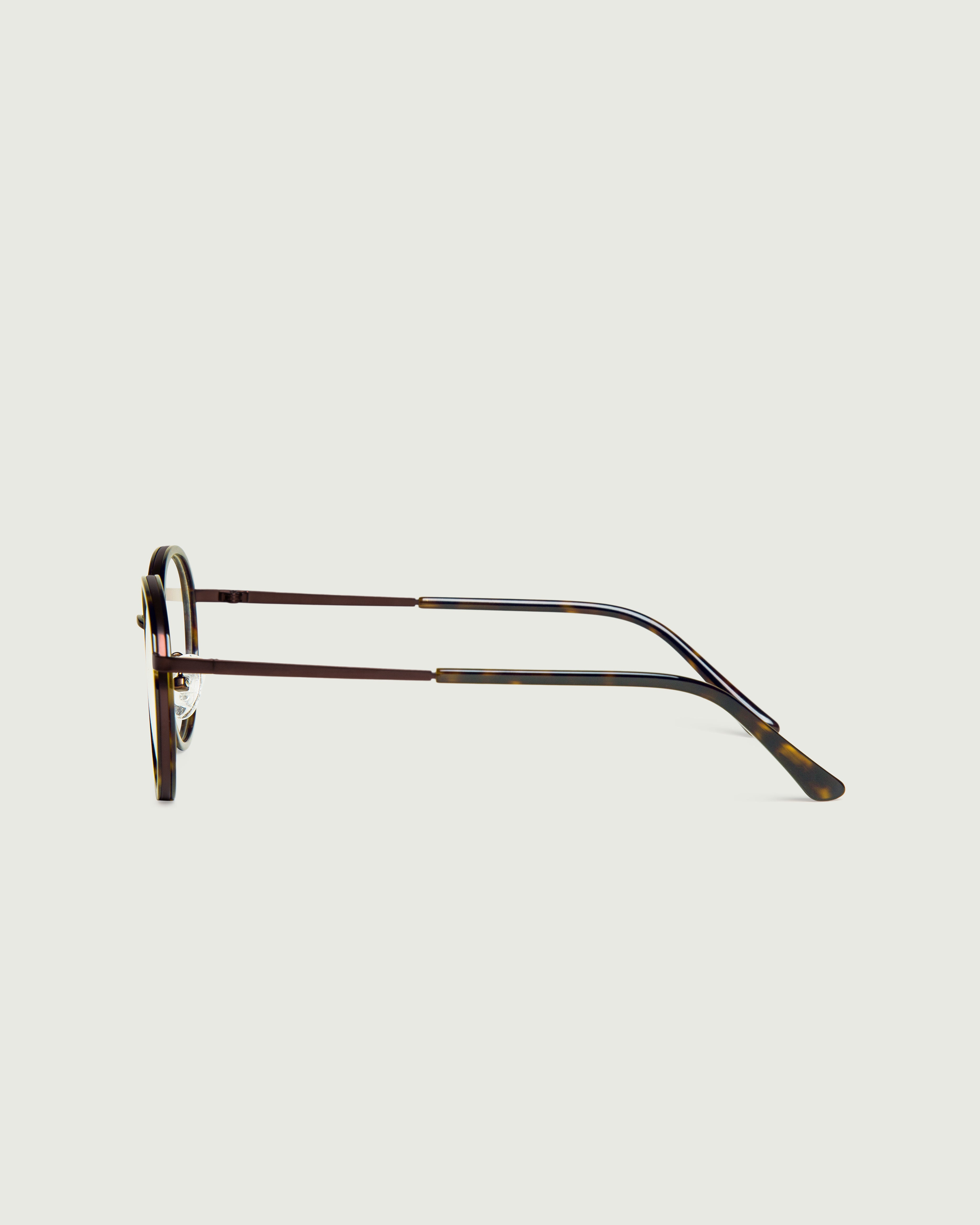 A round frame made with bio-acetate and stainless steel.