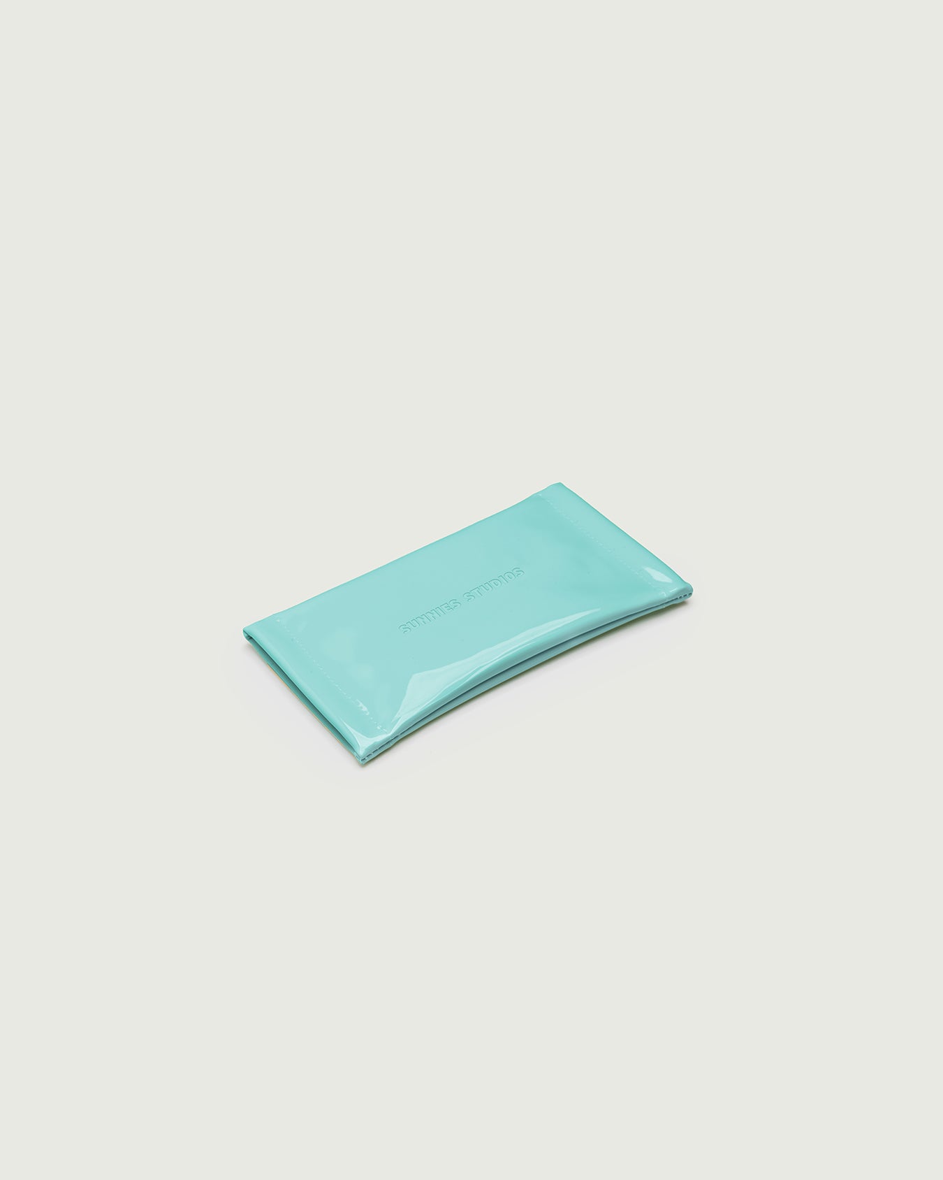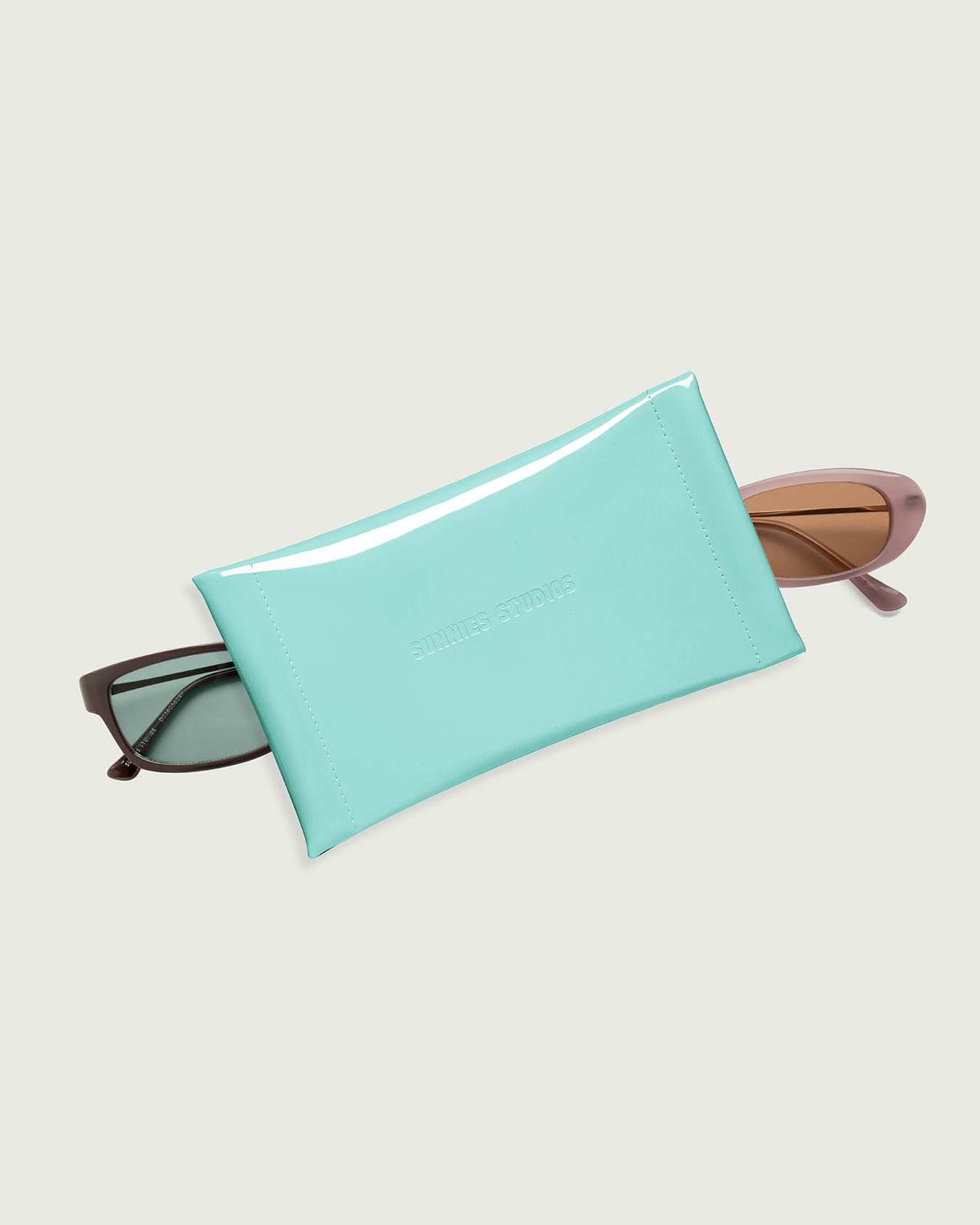 A double compartment sac designed to conveniently store two pairs of eyewear, sunglasses, or a pair of both. Now in a glossy patent material.