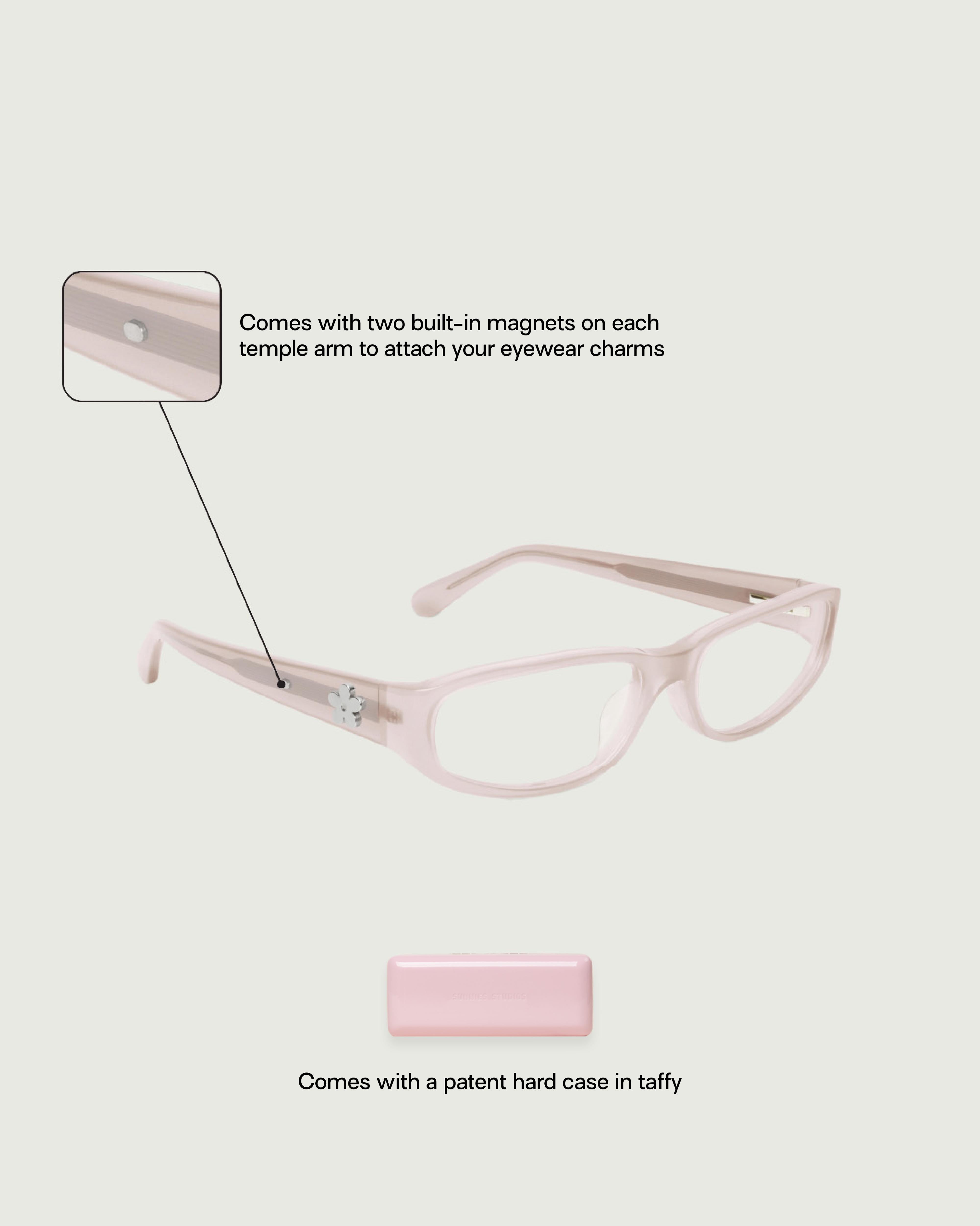 The temples arms are integrated with magnets to easily attach your eyewear charms — free with every purchase of Taffy frame with lens upgrade. Terms and conditions apply.