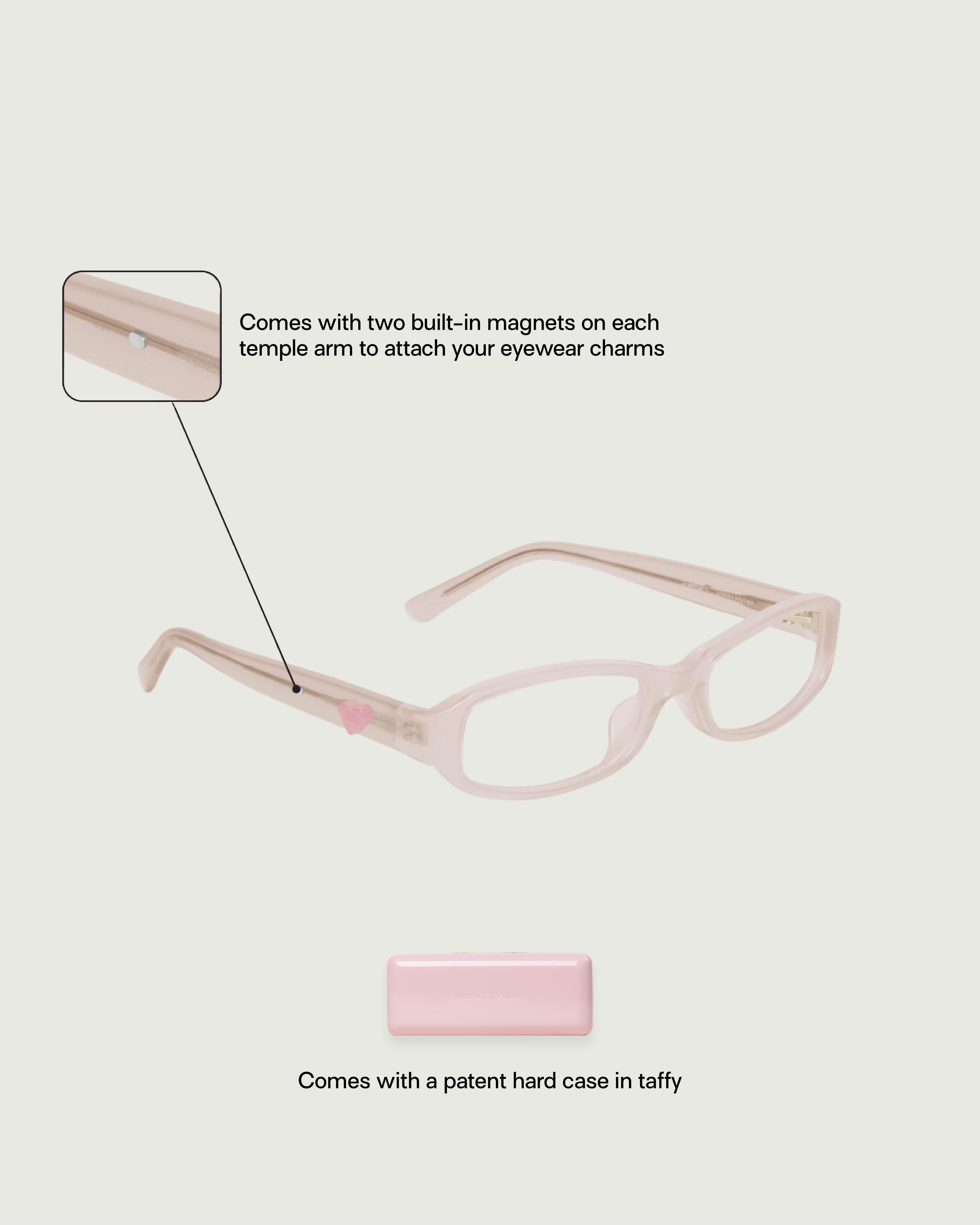 The temples arms are integrated with magnets to easily attach your eyewear charms — free with every purchase of Taffy frame with lens upgrade. Terms and conditions apply.