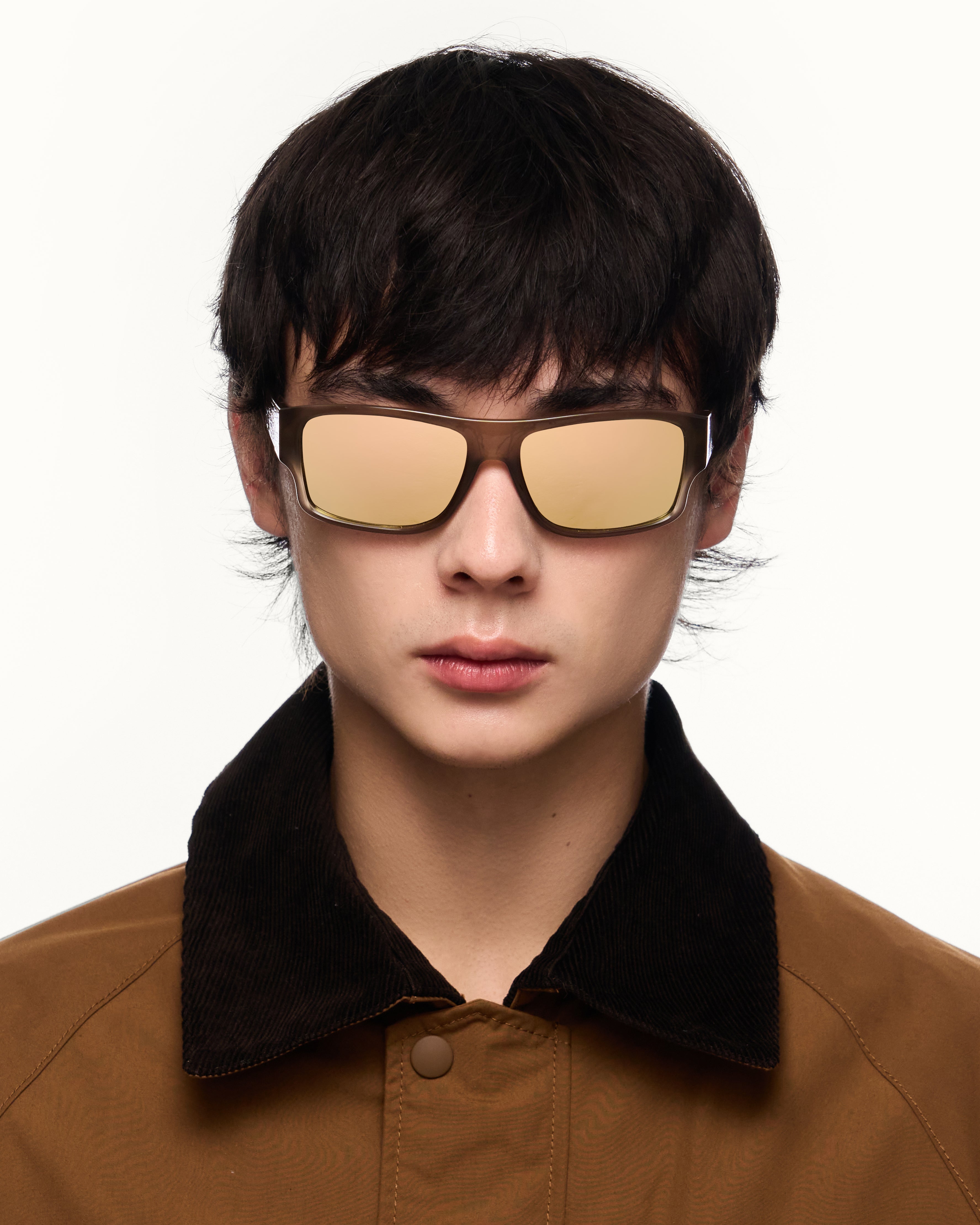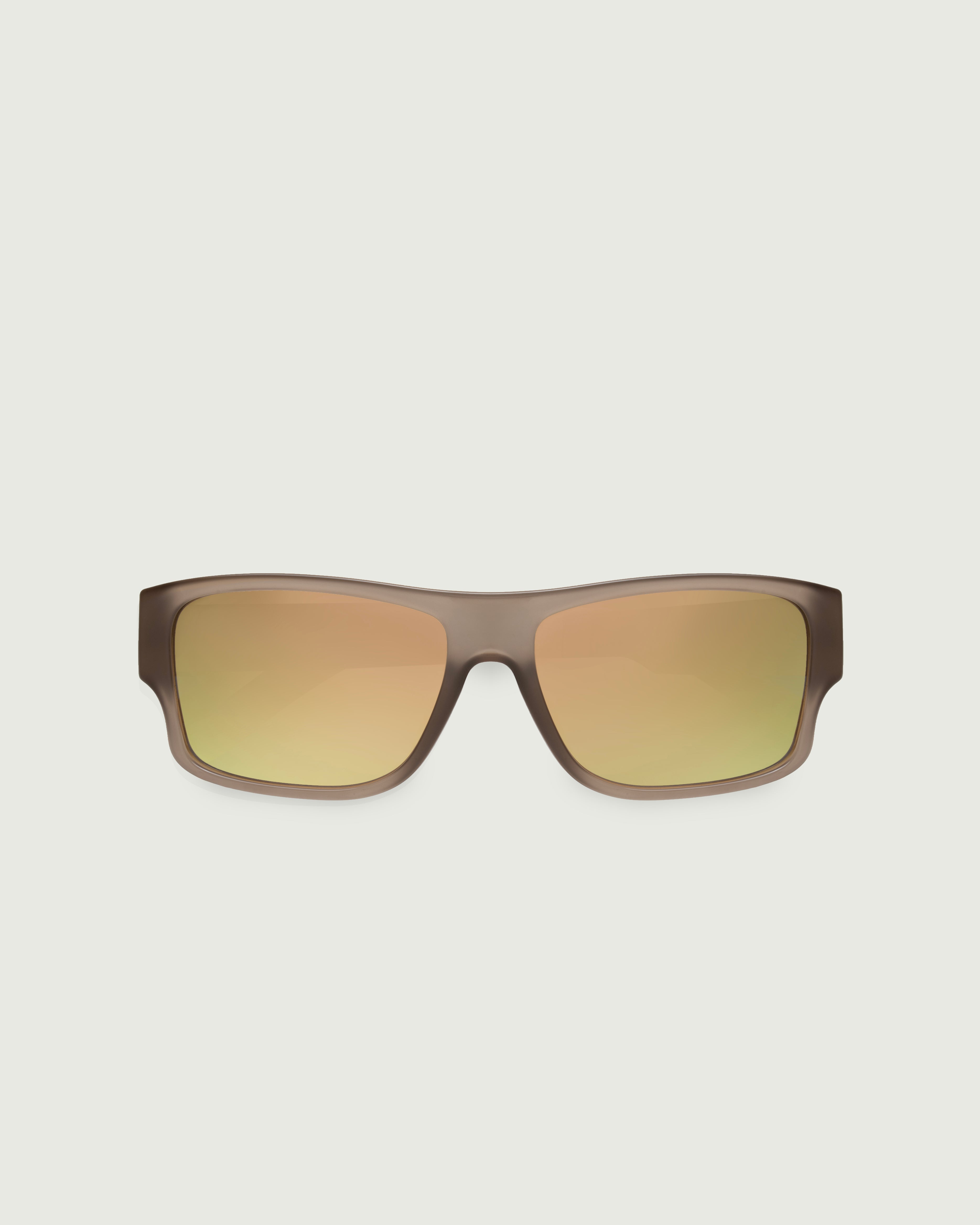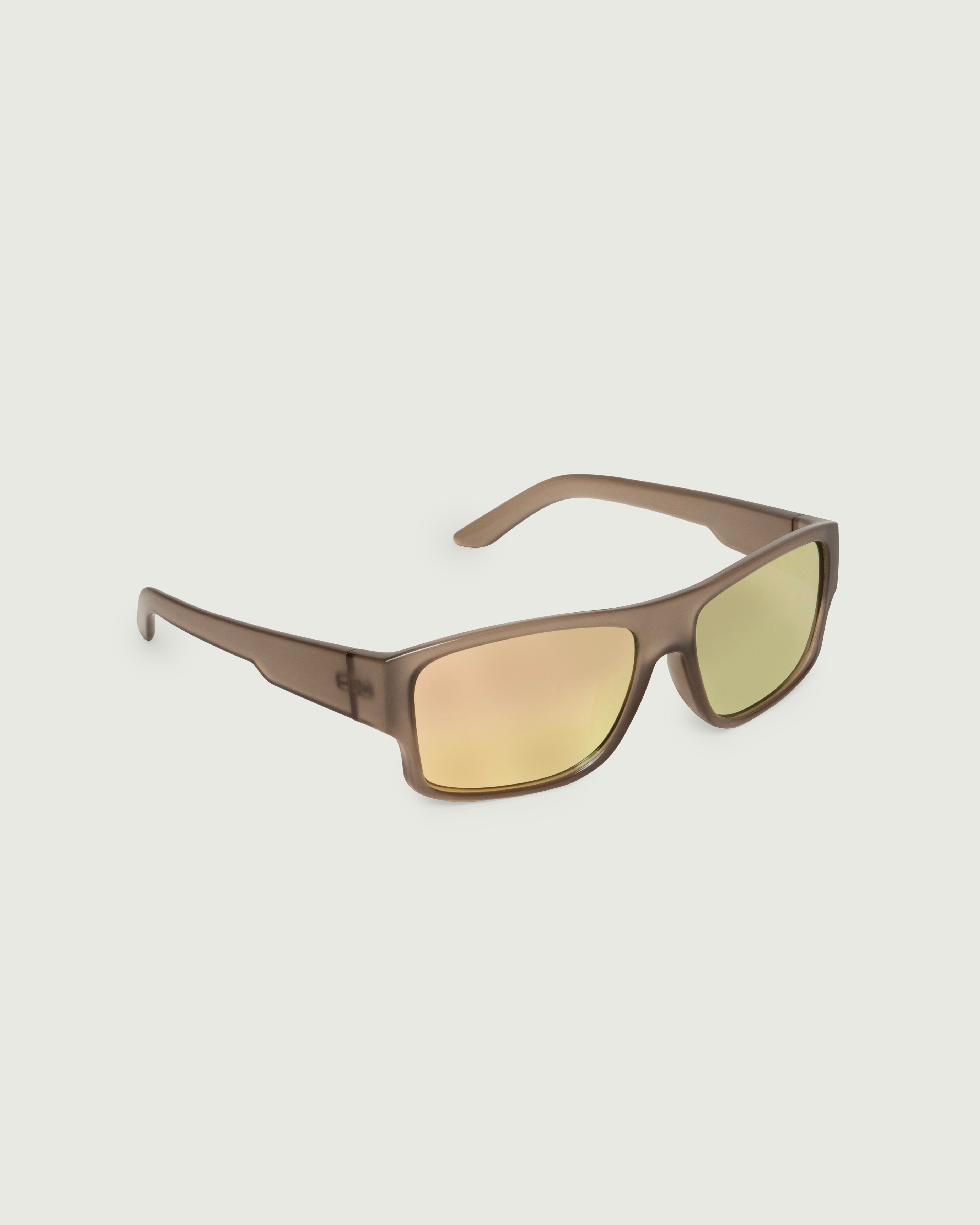 A wraparound square frame, available with revo and polarized lenses in ink, comet, and venus.