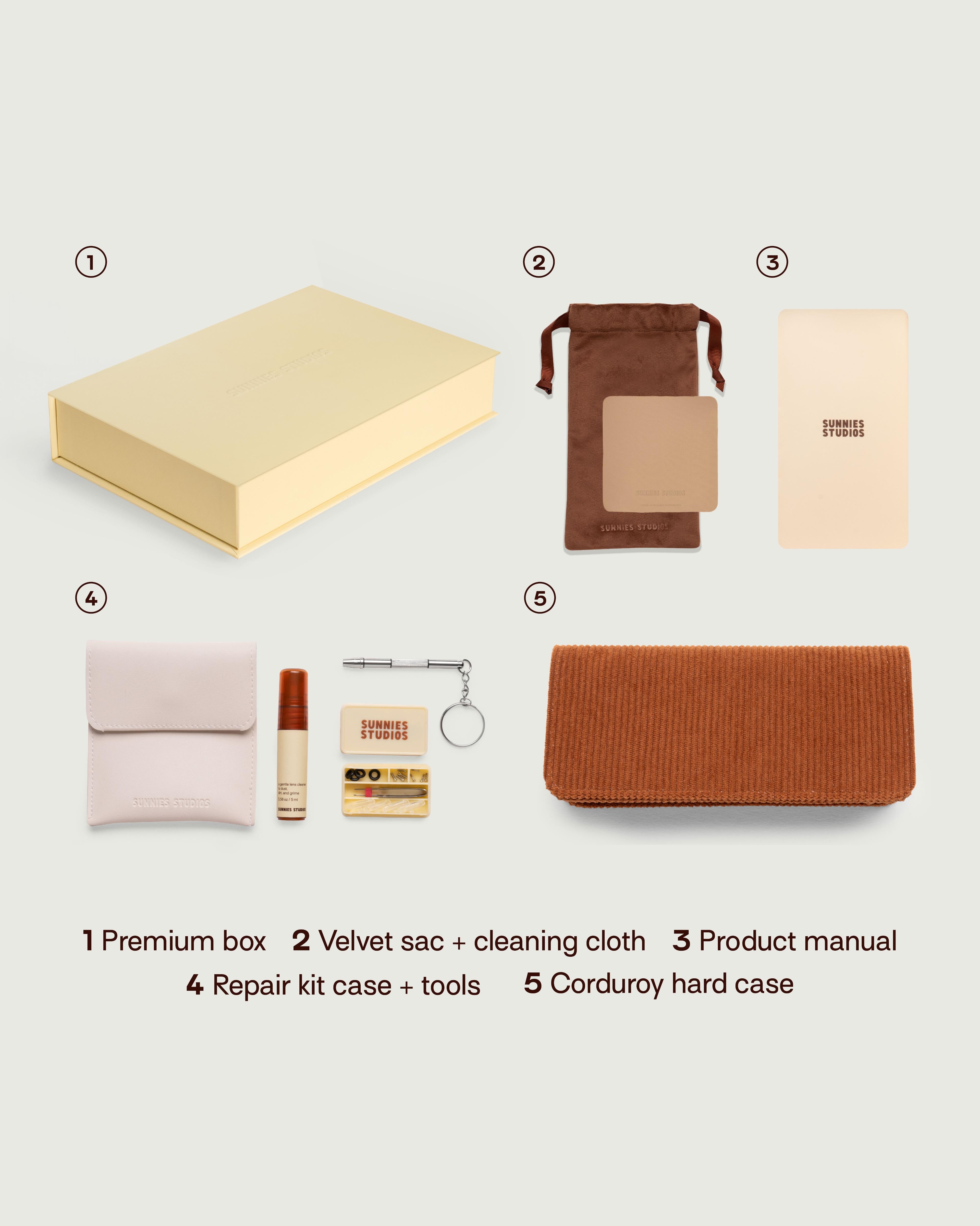 The Eyewear Kit is the ultimate all-in-one package to keep your frames in perfect condition. Inside, you'll find a luxurious velvet sac, a corduroy hard case, a microfiber cleaning cloth, and a compact repair kit with all the essential tools to protect, clean, and maintain your eyewear.