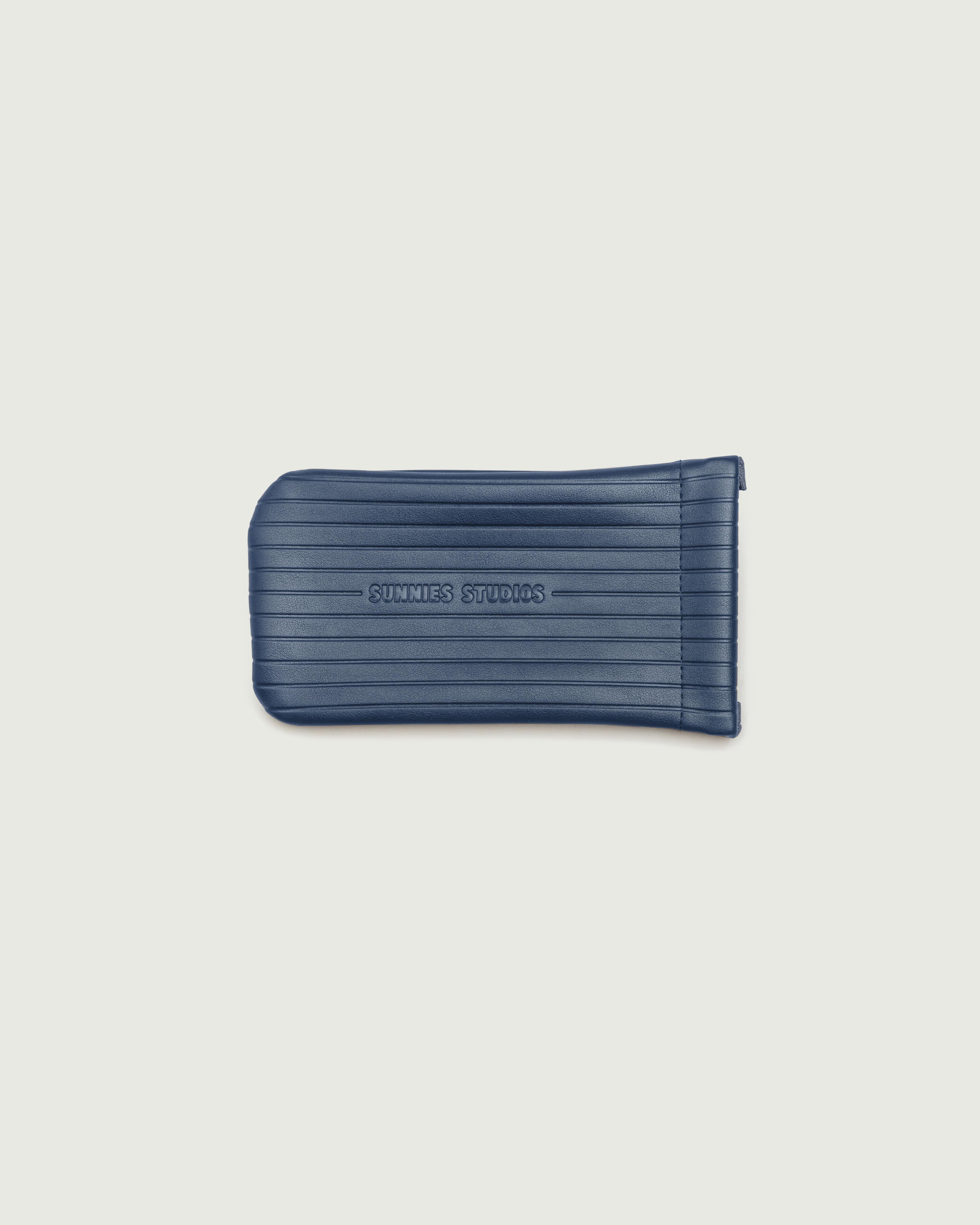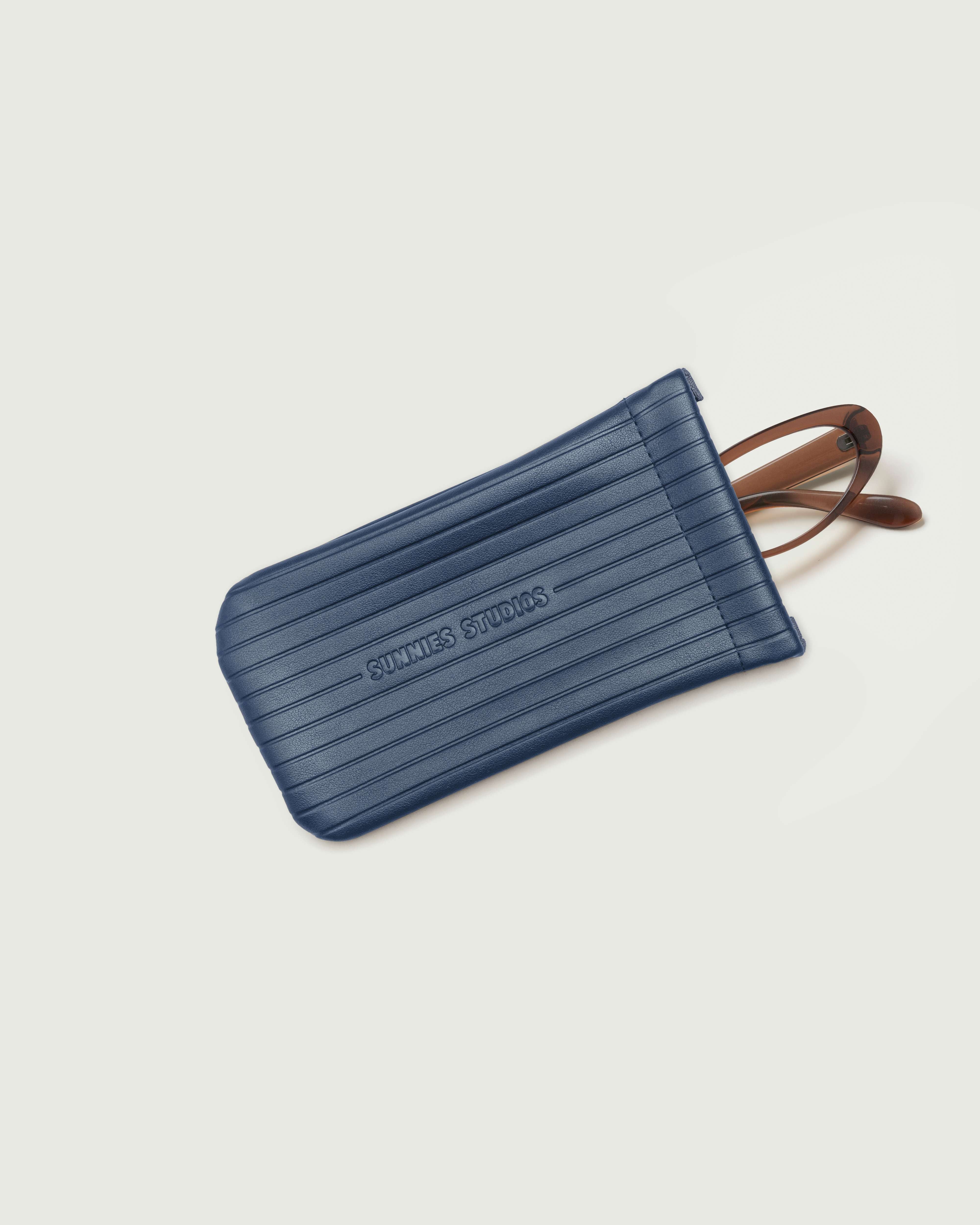 A two-toned sac with contrast piping designed to conveniently store one pair of frames.