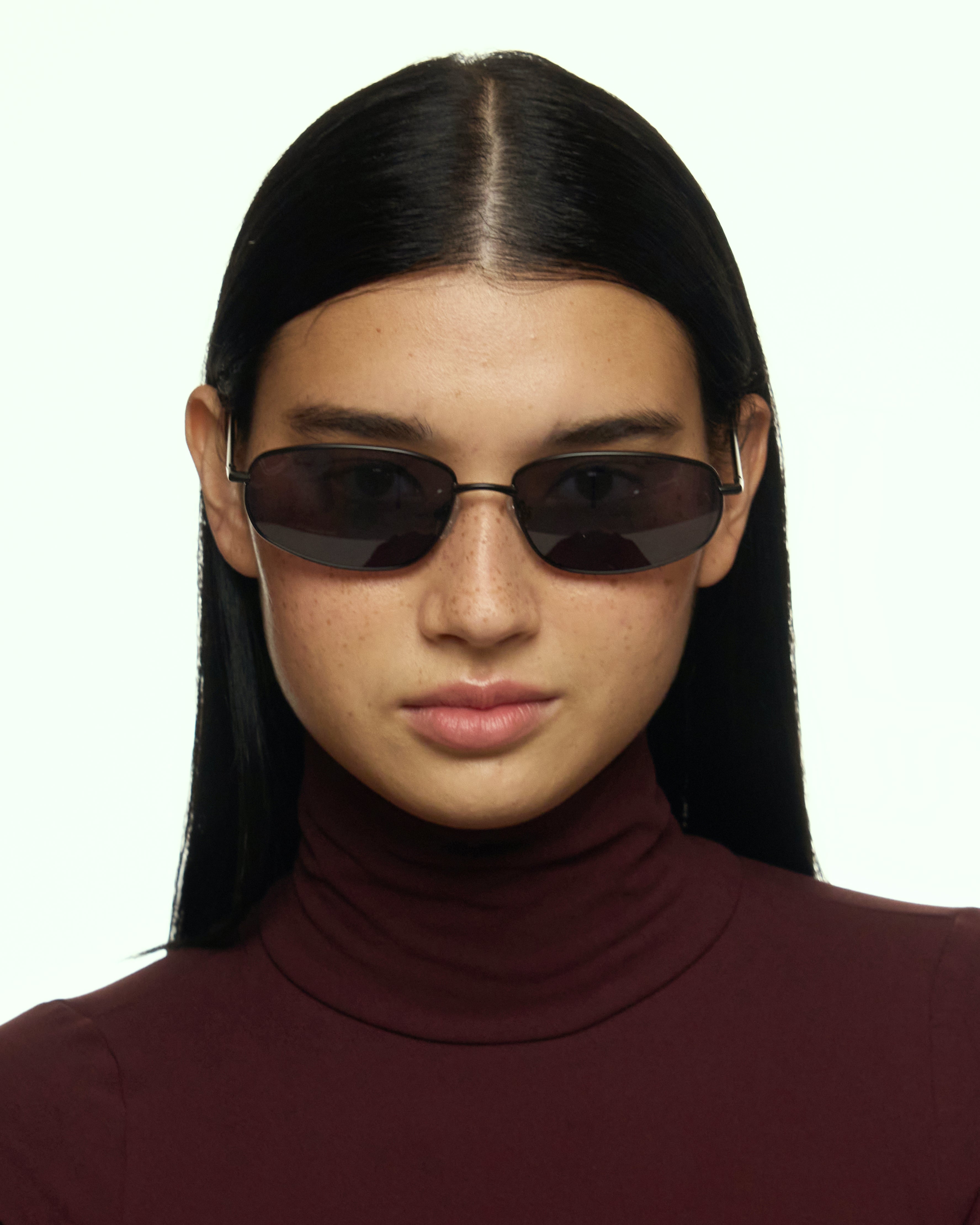 An upswept rectangular metal frame for a wide fit. Also available in a regular size.