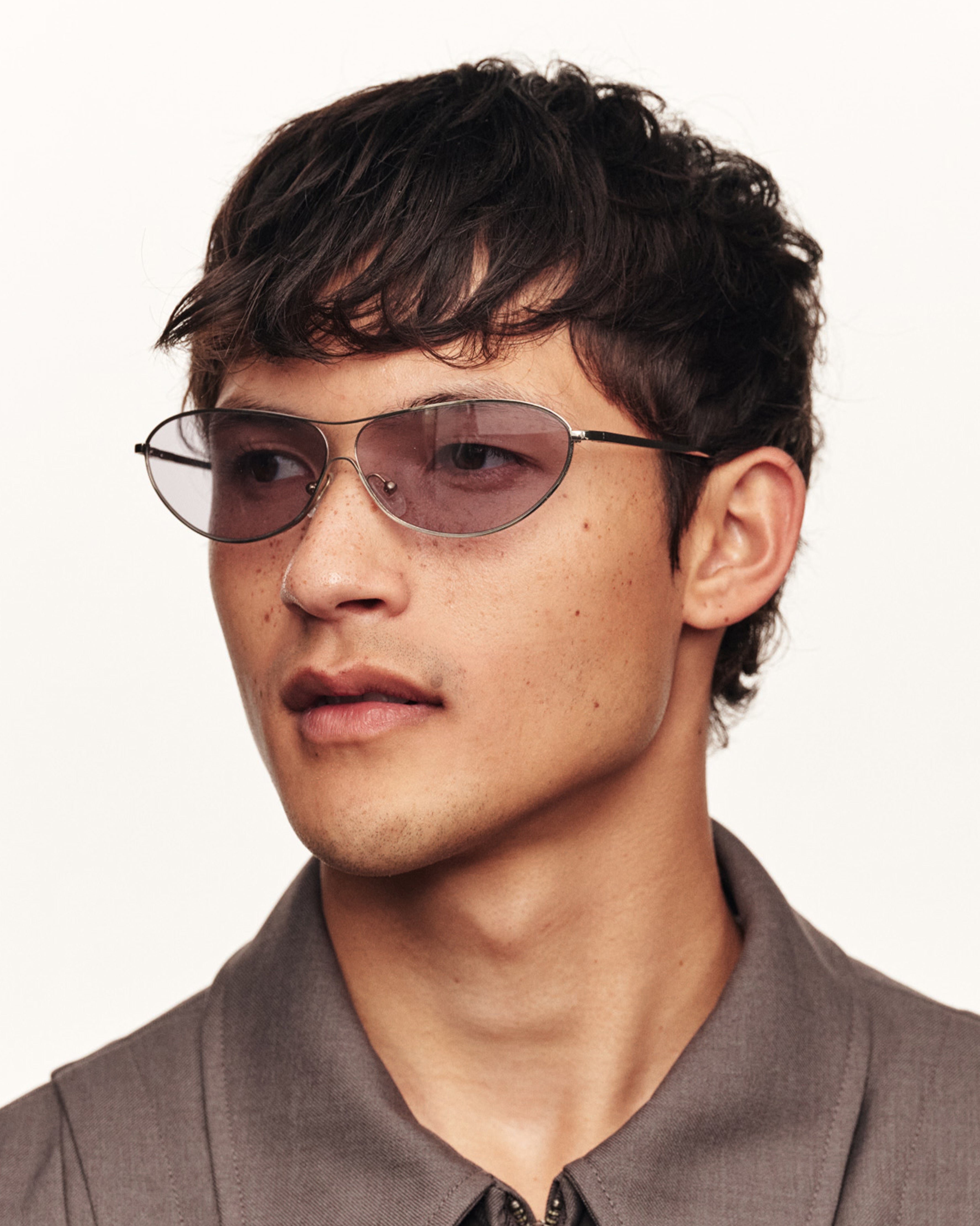 A modern pilot frame with upturned corners. Also Available in eyeglasses.